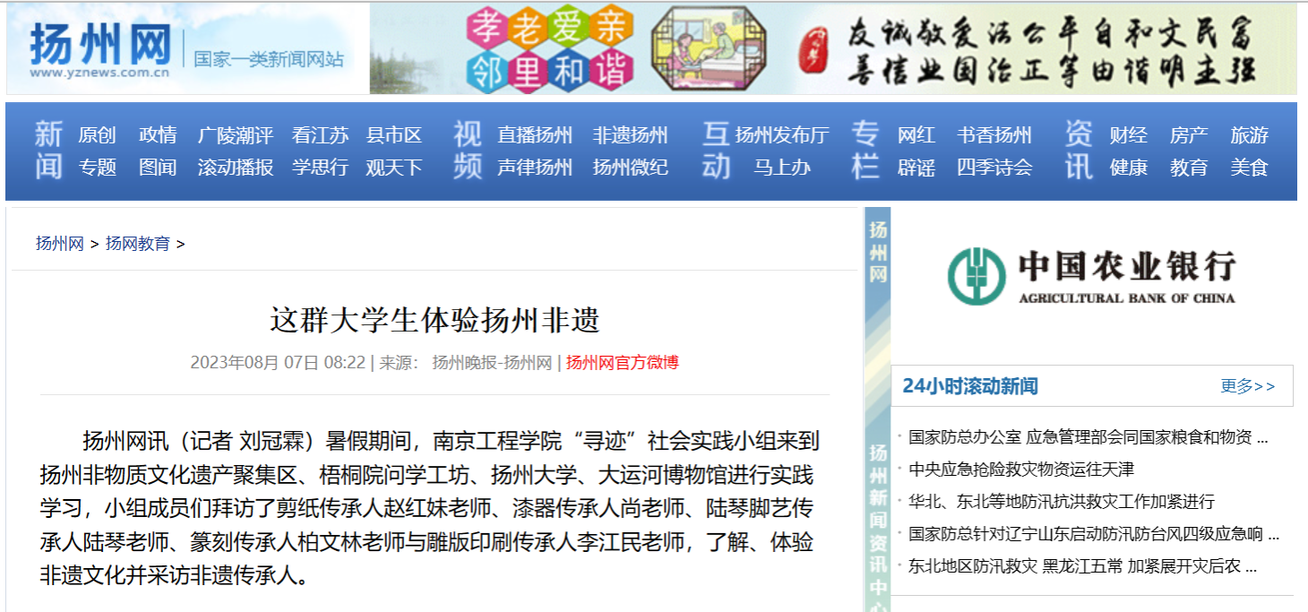 扬州网讯(记者 刘冠霖)暑假期间,beat365官方网站“寻迹”社会实践小组来到扬州非物质文化遗产聚集区、梧桐院问学工坊、扬州大学、大运河博物馆进行实践学习,小组成员们拜访了剪纸传承人赵红妹老师、漆器传承人尚老师、陆琴脚艺传承人陆琴老师、篆刻传承人柏文林老师与雕版印刷传承人李江民老师,了解、体验非遗文化并采访非遗传承人。