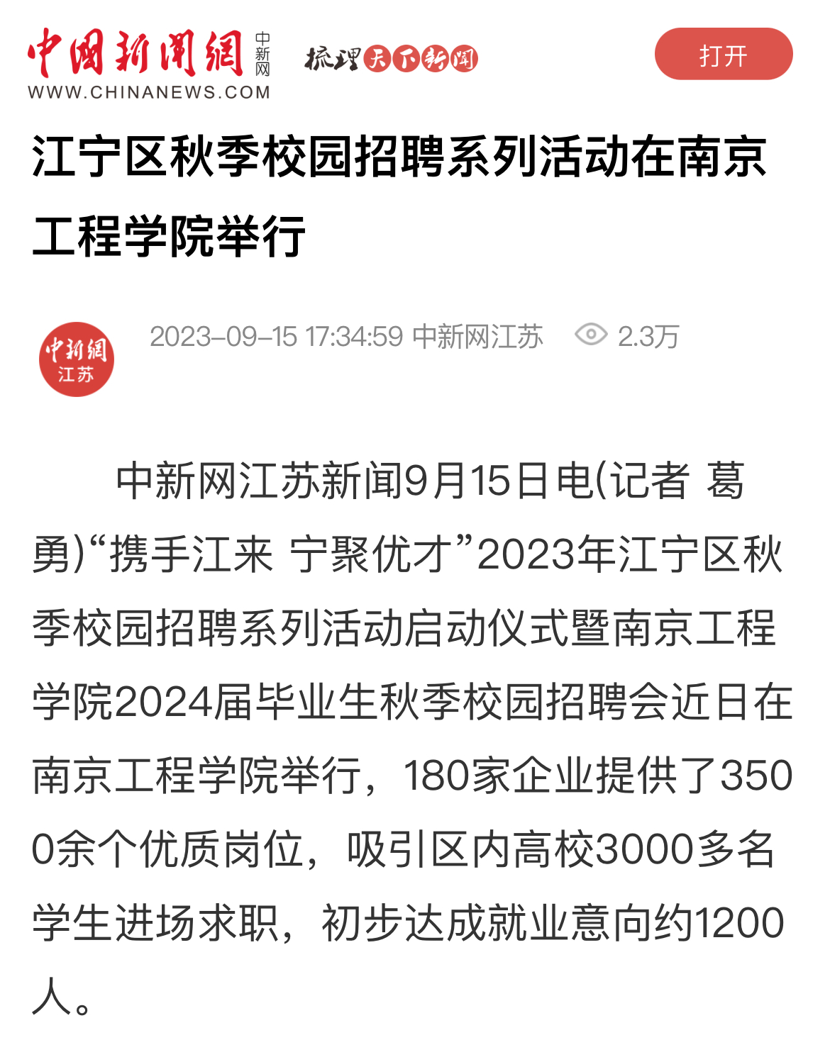 本次招聘会是“携手江来 宁聚优才”2023年江宁区秋季校园招聘系列活动的首场,接下来,主办方还将到南京航空航天大学、河海大学、南京林业大学、南京财经大学等高校,为毕业生提供更多优质的岗位信息。