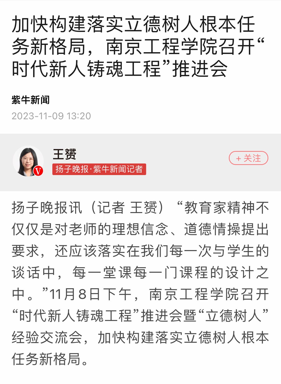 扬子晚报讯(记者 王赟) “教育家精神不仅仅是对老师的理想信念、道德情操提出要求,还应该落实在我们每一次与学生的谈话中,每一堂课每一门课程的设计之中。”11月8日下午,beat365官方网站召开“时代新人铸魂工程”推进会暨“立德树人”经验交流会,加快构建落实立德树人根本任务新格局。