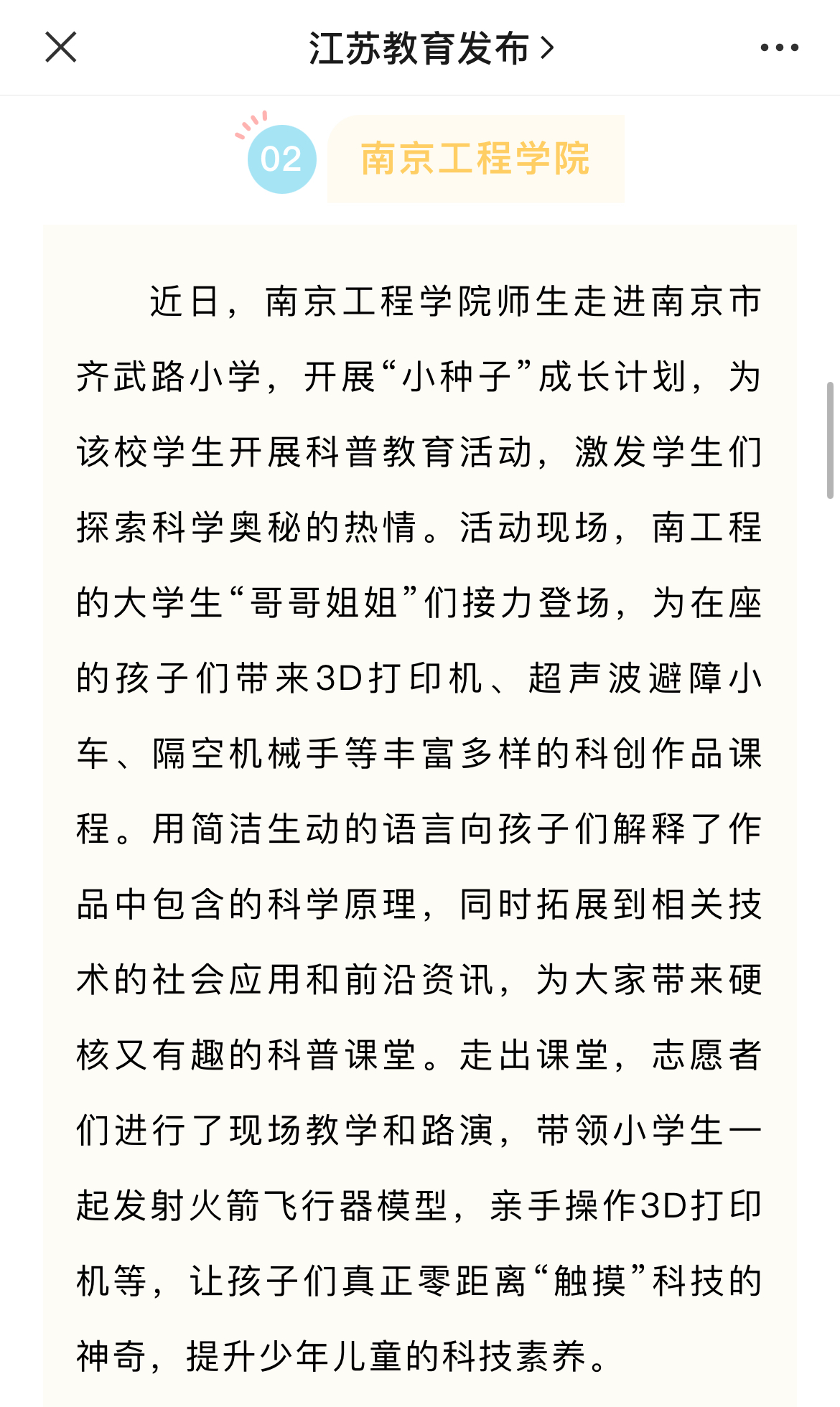 近日,beat365官方网站师生走进南京市齐武路小学,开展“小种子”成长计划,为该校学生开展科普教育活动,激发学生们探索科学奥秘的热情。活动现场,南工程的大学生“哥哥姐姐”们接力登场,为在座的孩子们带来3D打印机、超声波避障小车、隔空机械手等丰富多样的科创作品课程。用简洁生动的语言向孩子们解释了作品中包含的科学原理,同时拓展到相关技术的社会应用和前沿资讯,为大家带来硬核又有趣的科普课堂。走出课堂,志愿者们进行了现场教学和路演,带领小学生一起发射火箭飞行器模型,亲手操作3D打印机等,让孩子们真正零距离“触摸”科技的神奇,提升少年儿童的科技素养。