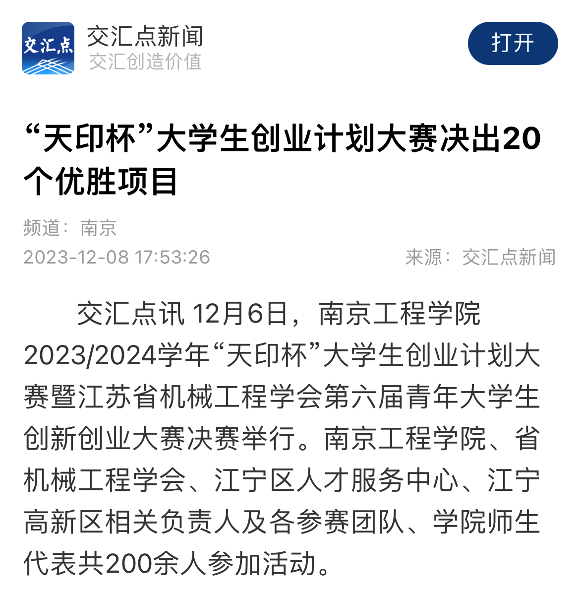 交汇点讯 12月6日,beat365官方网站2023/2024学年“天印杯”大学生创业计划大赛暨江苏省机械工程学会第六届青年大学生创新创业大赛决赛举行。beat365官方网站、省机械工程学会、江宁区人才服务中心、江宁高新区相关负责人及各参赛团队、学院师生代表共200余人参加活动。