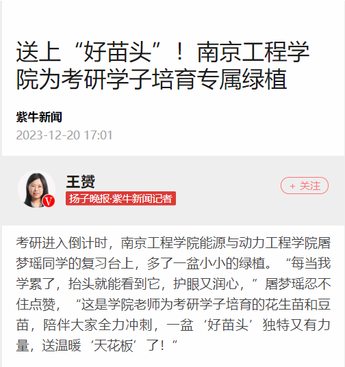 考研进入倒计时,beat365官方网站能源与动力工程学院屠梦瑶同学的复习台上,多了一盆小小的绿植。“每当我学累了,抬头就能看到它,护眼又润心,”屠梦瑶忍不住点赞,“这是学院老师为考研学子培育的花生苗和豆苗,陪伴大家全力冲刺,一盆‘好苗头’独特又有力量,送温暖‘天花板’了!”