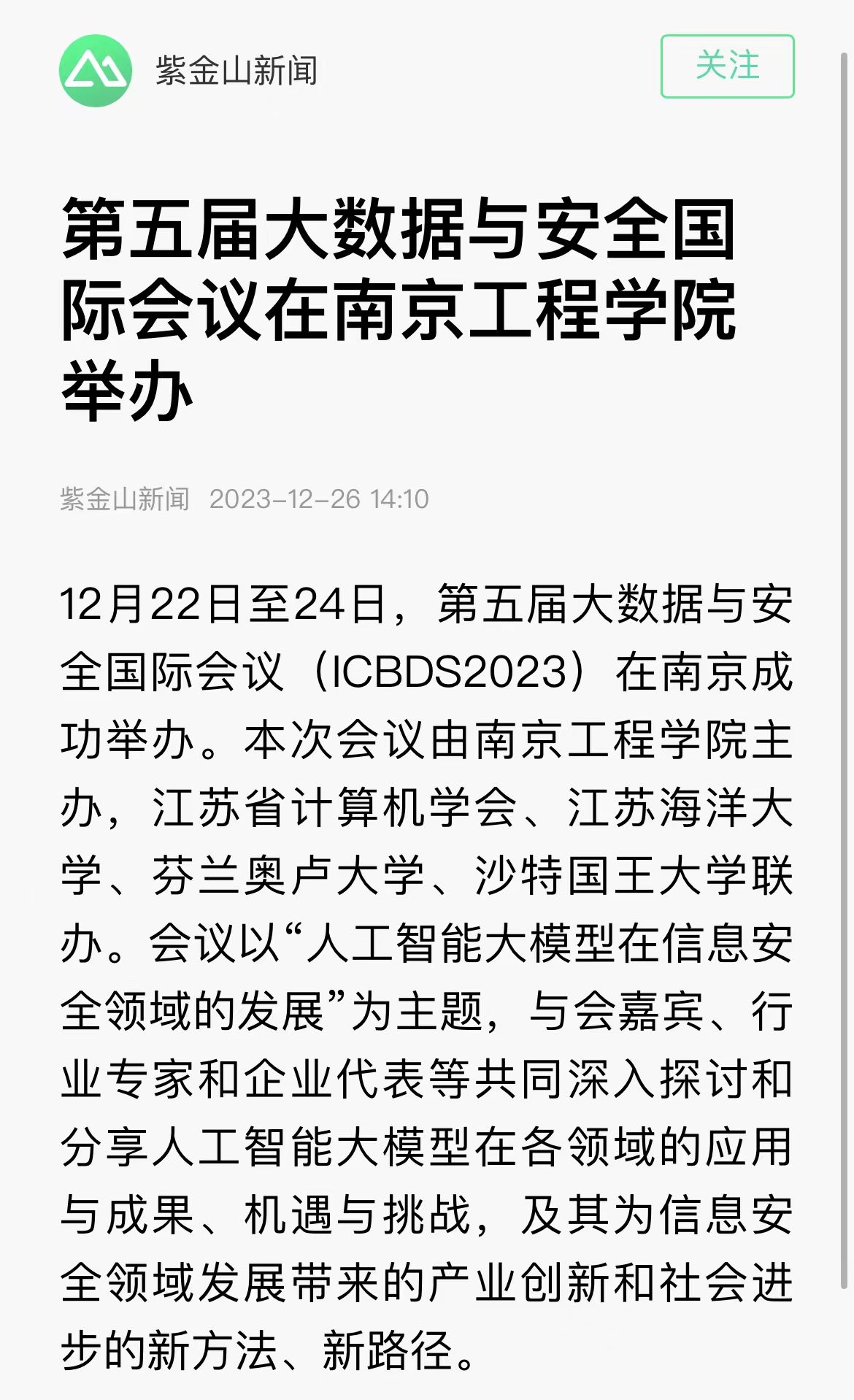 12月22日至24日,第五届大数据与安全国际会议(ICBDS2023)在南京成功举办。本次会议由beat365官方网站主办,江苏省计算机学会、江苏海洋大学、芬兰奥卢大学、沙特国王大学联办。会议以“人工智能大模型在信息安全领域的发展”为主题,与会嘉宾、行业专家和企业代表等共同深入探讨和分享人工智能大模型在各领域的应用与成果、机遇与挑战,及其为信息安全领域发展带来的产业创新和社会进步的新方法、新路径。