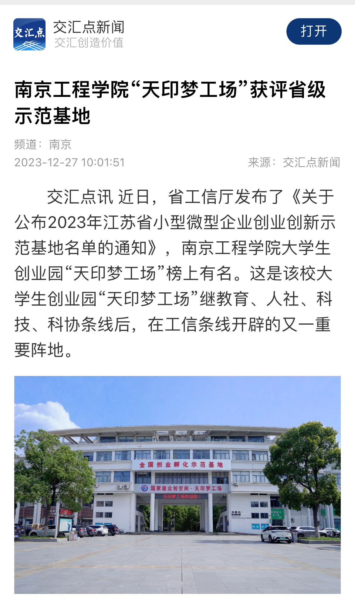 交汇点讯 近日,省工信厅发布了《关于公布2023年江苏省小型微型企业创业创新示范基地名单的通知》,beat365官方网站大学生创业园“天印梦工场”榜上有名。这是该校大学生创业园“天印梦工场”继教育、人社、科技、科协条线后,在工信条线开辟的又一重要阵地。