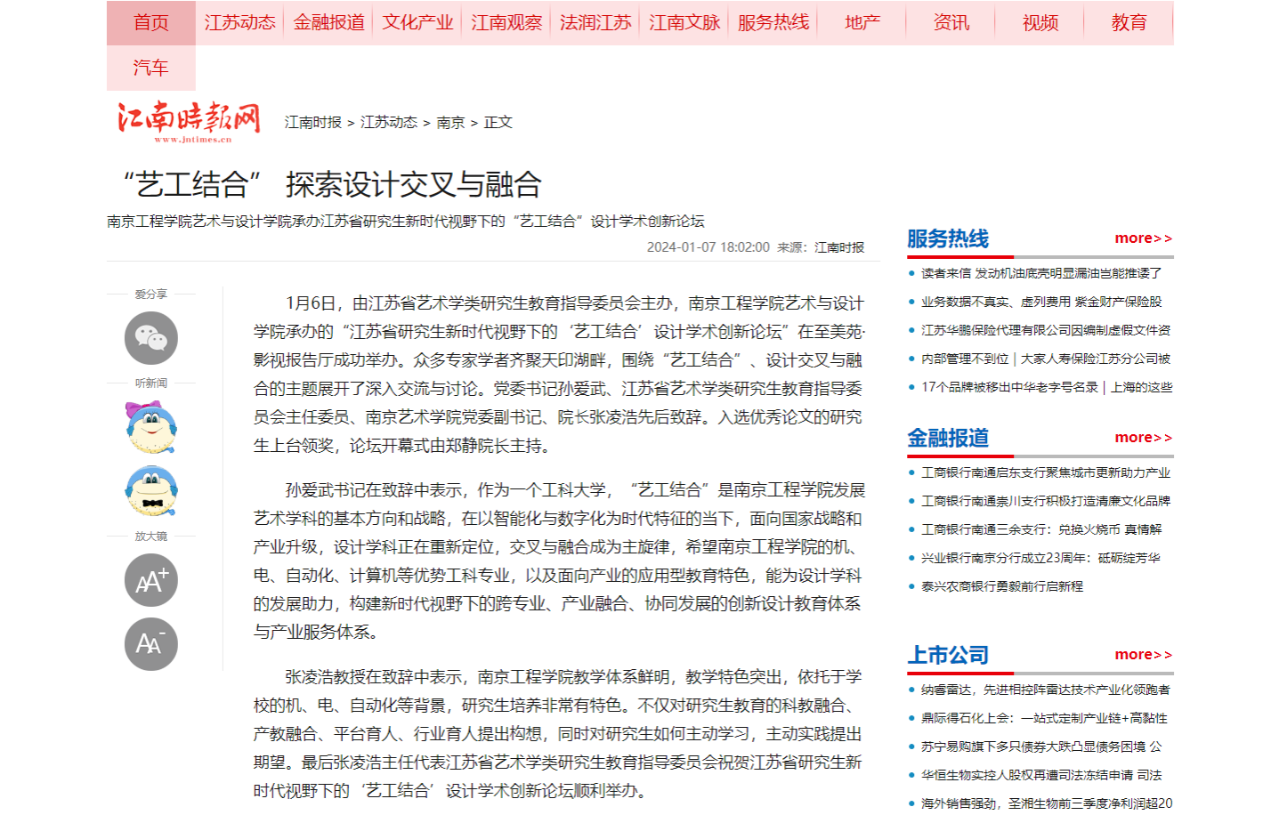 1月6日,由江苏省艺术学类研究生教育指导委员会主办,beat365官方网站艺术与设计学院承办的“江苏省研究生新时代视野下的‘艺工结合’设计学术创新论坛”在至美苑·影视报告厅成功举办。众多专家学者齐聚天印湖畔,围绕“艺工结合”、设计交叉与融合的主题展开了深入交流与讨论。党委书记孙爱武、江苏省艺术学类研究生教育指导委员会主任委员、南京艺术学院党委副书记、院⻓张凌浩先后致辞。入选优秀论文的研究生上台领奖,论坛开幕式由郑静院长主持。