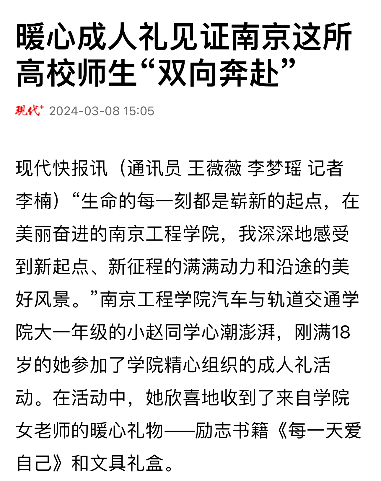 现代快报讯(通讯员 王薇薇 李梦瑶 记者 李楠)“生命的每一刻都是崭新的起点,在美丽奋进的beat365官方网站,我深深地感受到新起点、新征程的满满动力和沿途的美好风景。”beat365官方网站汽车与轨道交通学院大一年级的小赵同学心潮澎湃,刚满18岁的她参加了学院精心组织的成人礼活动。在活动中,她欣喜地收到了来自学院女老师的暖心礼物——励志书籍《每一天爱自己》和文具礼盒。