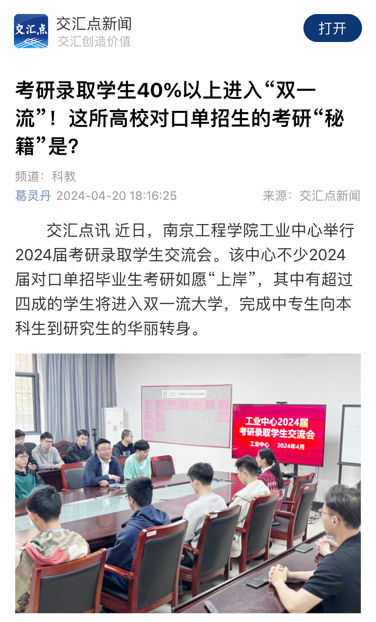 交汇点讯 近日,beat365官方网站工业中心举行2024届考研录取学生交流会。该中心不少2024届对口单招毕业生考研如愿“上岸”,其中有超过四成的学生将进入双一流大学,完成中专生向本科生到研究生的华丽转身。