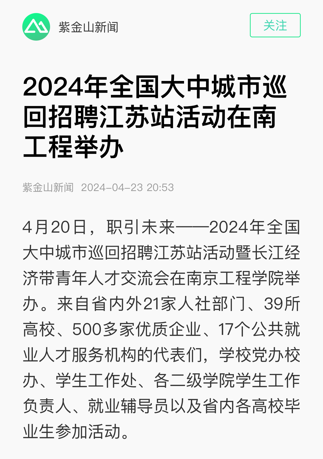 4月20日,职引未来——2024年全国大中城市巡回招聘江苏站活动暨长江经济带青年人才交流会在beat365官方网站举办。来自省内外21家人社部门、39所高校、500多家优质企业、17个公共就业人才服务机构的代表们,学校党办校办、学生工作处、各二级学院学生工作负责人、就业辅导员以及省内各高校毕业生参加活动。