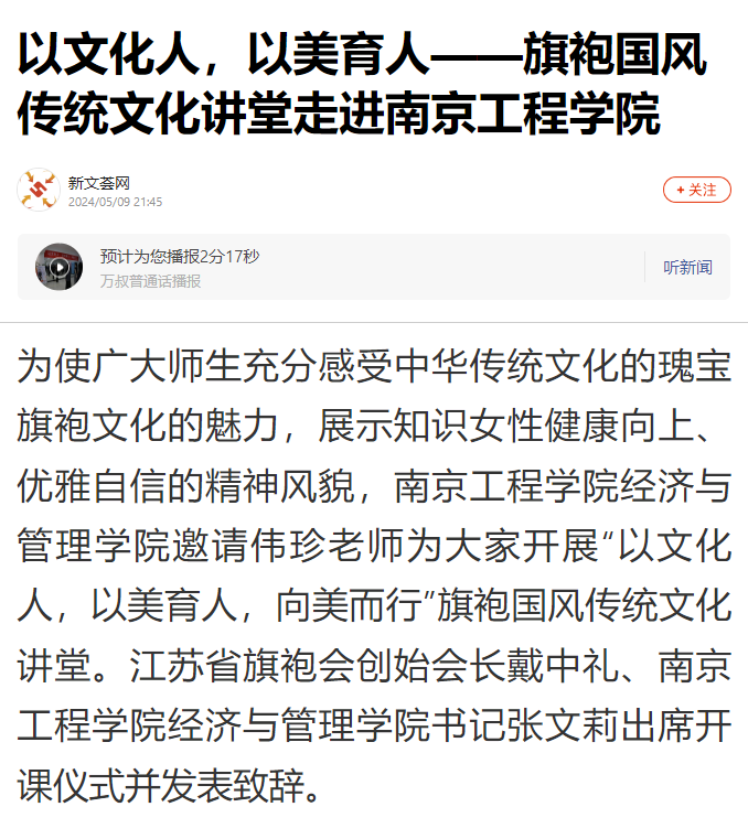 开展旗袍国风传统文化讲堂活动旨在大力弘扬中华优秀传统文化、传递美育理念,以美育滋养美好生活,提升广大师生的审美情趣和人文素养,充分展现了当代高校师生自身修养和品味的不断提升,展现了新时代女性不俗的生活追求,树立了高校女性师生的良好形象,推动校园精神文明建设。(娄梅)