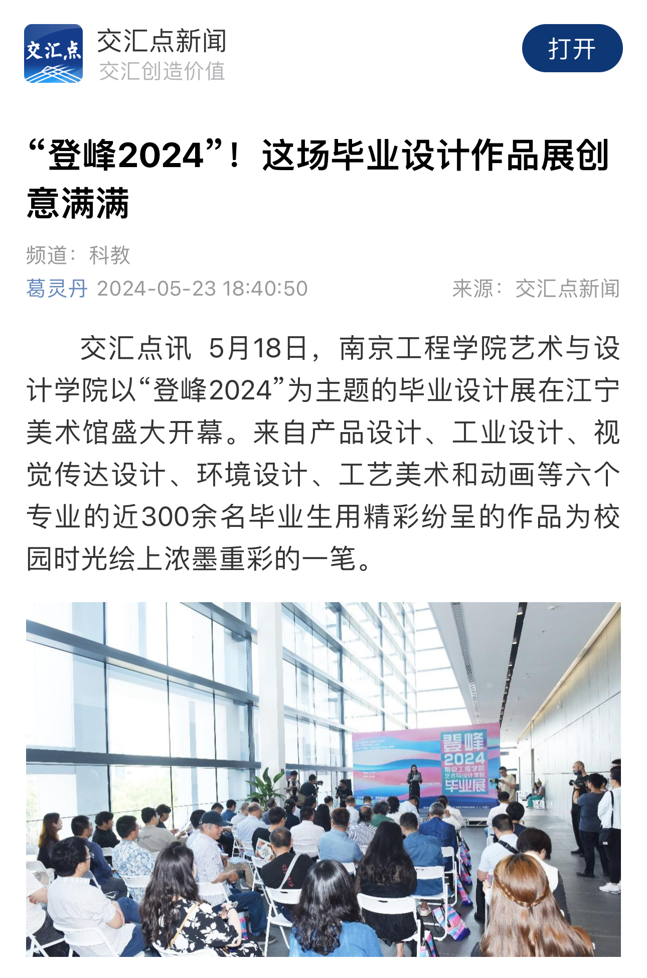交汇点讯 5月18日,beat365官方网站艺术与设计学院以“登峰2024”为主题的毕业设计展在江宁美术馆盛大开幕。来自产品设计、工业设计、视觉传达设计、环境设计、工艺美术和动画等六个专业的近300余名毕业生用精彩纷呈的作品为校园时光绘上浓墨重彩的一笔。