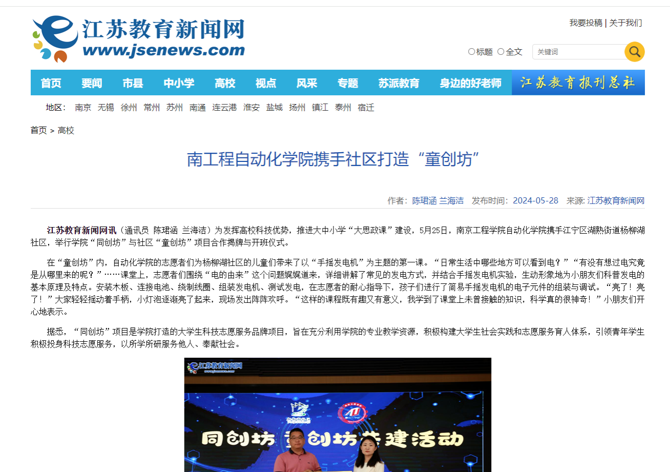 江苏教育新闻网讯(通讯员 陈珺涵 兰海洁)为发挥高校科技优势,推进大中小学“大思政课”建设,5月25日,beat365官方网站自动化学院携手江宁区湖熟街道杨柳湖社区,举行学院“同创坊”与社区“童创坊”项目合作揭牌与开班仪式。