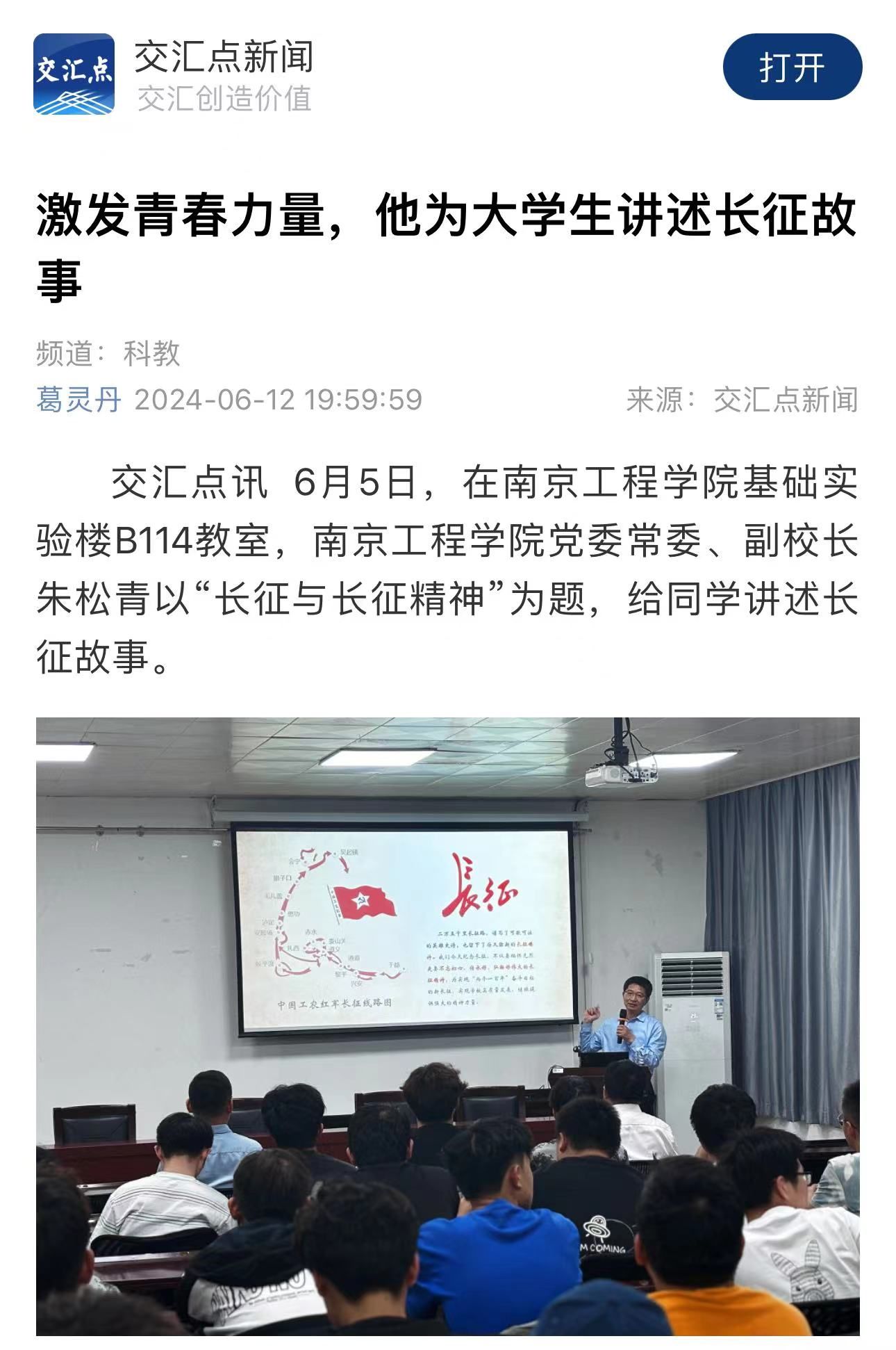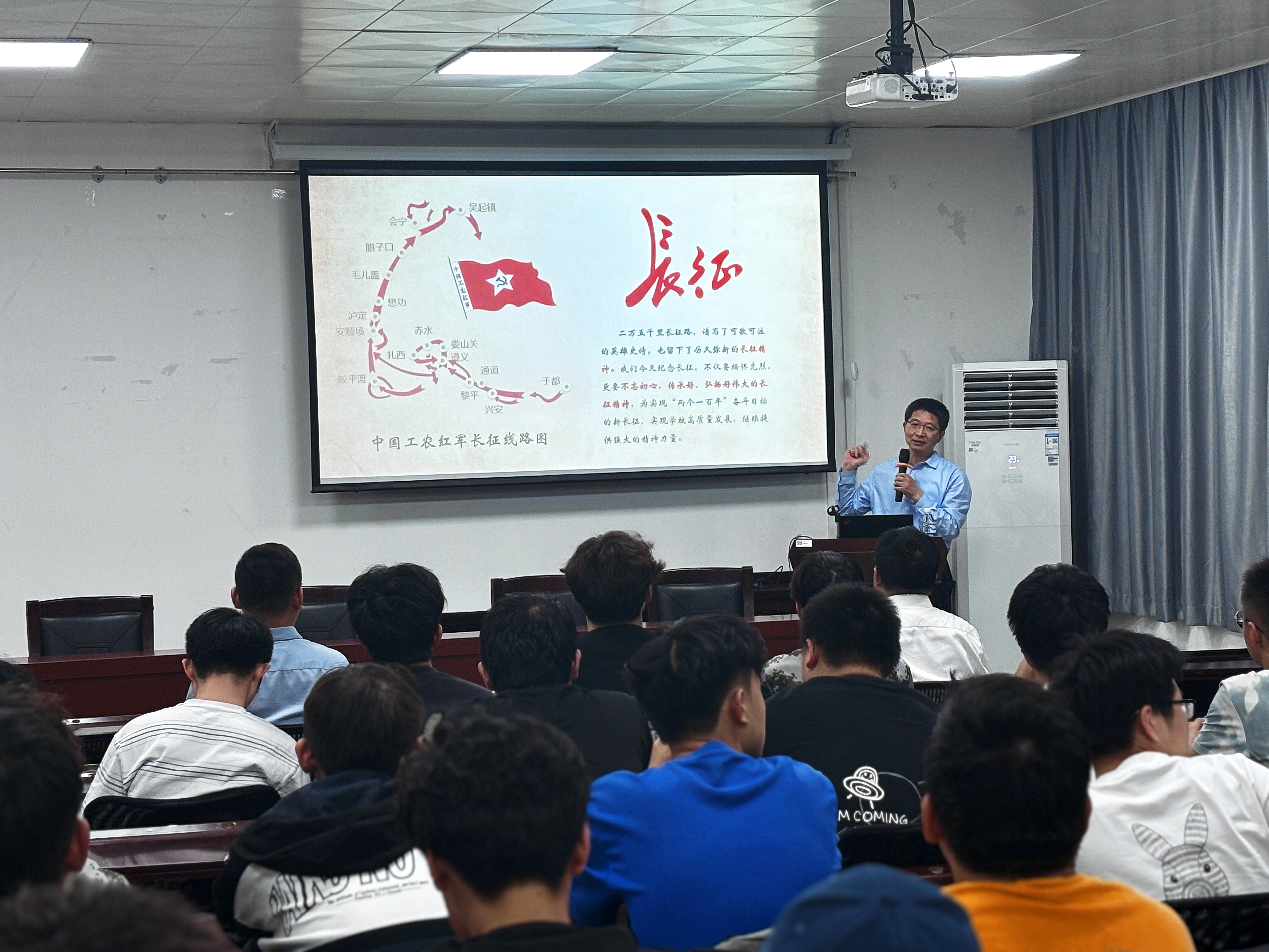 交汇点讯 6月5日,在beat365官方网站基础实验楼B114教室,beat365官方网站党委常委、副校长朱松青以“长征与长征精神”为题,给同学讲述长征故事。