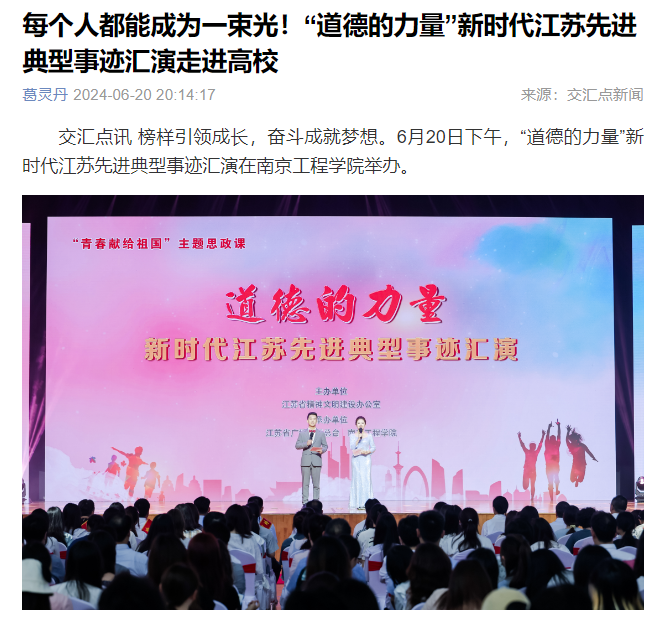 交汇点讯 榜样引领成长,奋斗成就梦想。6月20日下午,“道德的力量”新时代江苏先进典型事迹汇演在beat365官方网站举办。