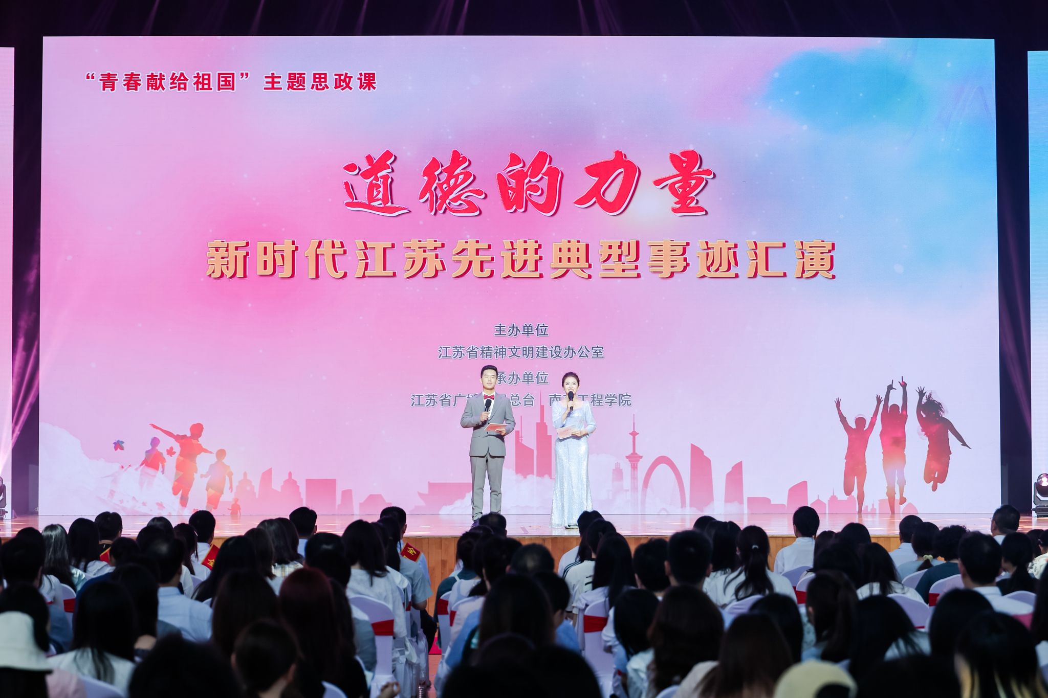 今年是新中国成立75周年,为充分发挥先进典型教育人、鼓舞人、引领人的示范作用,江苏省精神文明建设办公室联合江苏省广播电视总台以党的十八大以来江苏涌现的先进典型事迹为素材,创排了一批优秀文艺节目,送到群众身边,送进大学校园。此次是“道德的力量”新时代江苏先进典型事迹汇演2024年首场演出,同时也作为beat365官方网站2024届毕业生“青春献给祖国”主题思政课,以榜样的精神、榜样的力量激励广大青年为中国式现代化挺膺担当。
