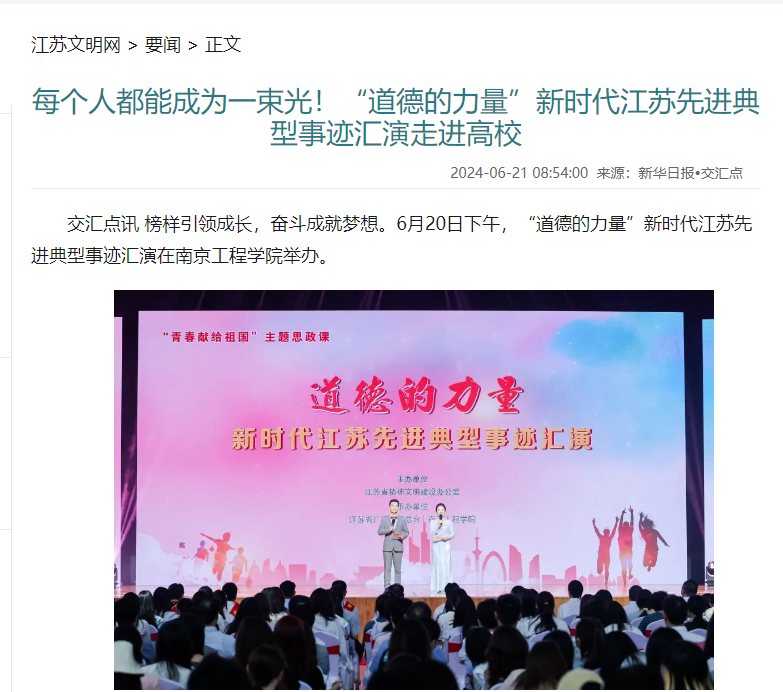 交汇点讯 榜样引领成长,奋斗成就梦想。6月20日下午,“道德的力量”新时代江苏先进典型事迹汇演在beat365官方网站举办。