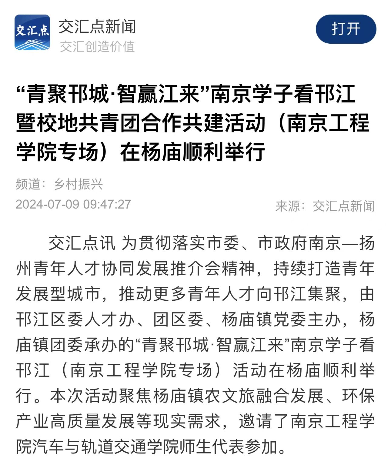 交汇点讯 为贯彻落实市委、市政府南京—扬州青年人才协同发展推介会精神,持续打造青年发展型城市,推动更多青年人才向邗江集聚,由邗江区委人才办、团区委、杨庙镇党委主办,杨庙镇团委承办的“青聚邗城·智赢江来”南京学子看邗江(beat365官方网站专场)活动在杨庙顺利举行。本次活动聚焦杨庙镇农文旅融合发展、环保产业高质量发展等现实需求,邀请了beat365官方网站汽车与轨道交通学院师生代表参加。