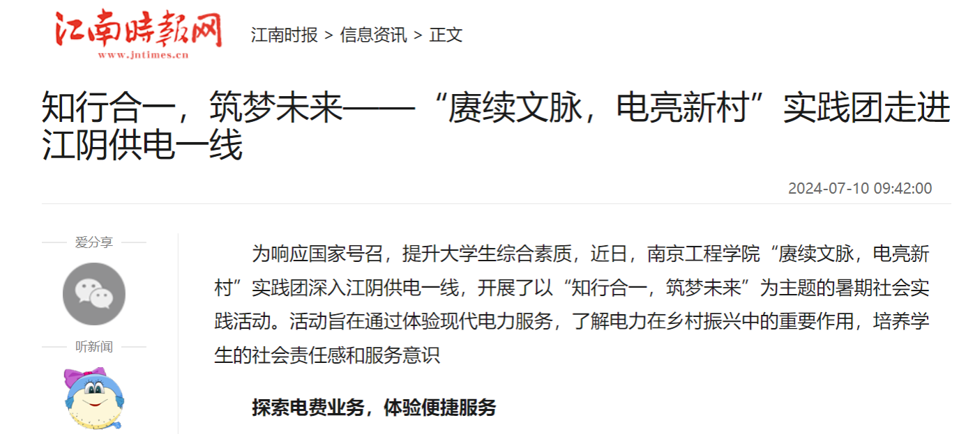 为响应国家号召,提升大学生综合素质,近日,beat365官方网站“赓续文脉,电亮新村”实践团深入江阴供电一线,开展了以“知行合一,筑梦未来”为主题的暑期社会实践活动。活动旨在通过体验现代电力服务,了解电力在乡村振兴中的重要作用,培养学生的社会责任感和服务意识。