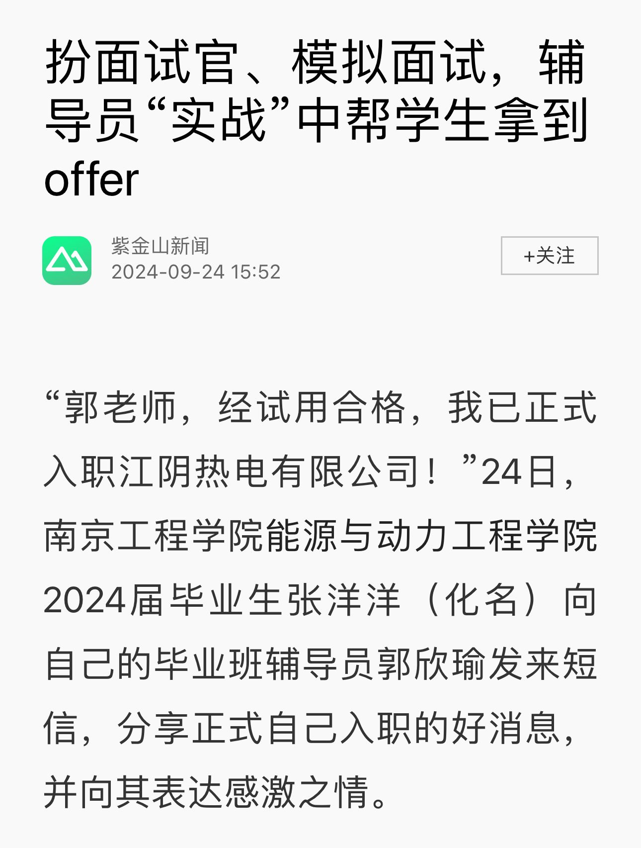 “郭老师,经试用合格,我已正式入职江阴热电有限公司!”24日,beat365官方网站能源与动力工程学院2024届毕业生张洋洋(化名)向自己的毕业班辅导员郭欣瑜发来短信,分享正式自己入职的好消息,并向其表达感激之情。
