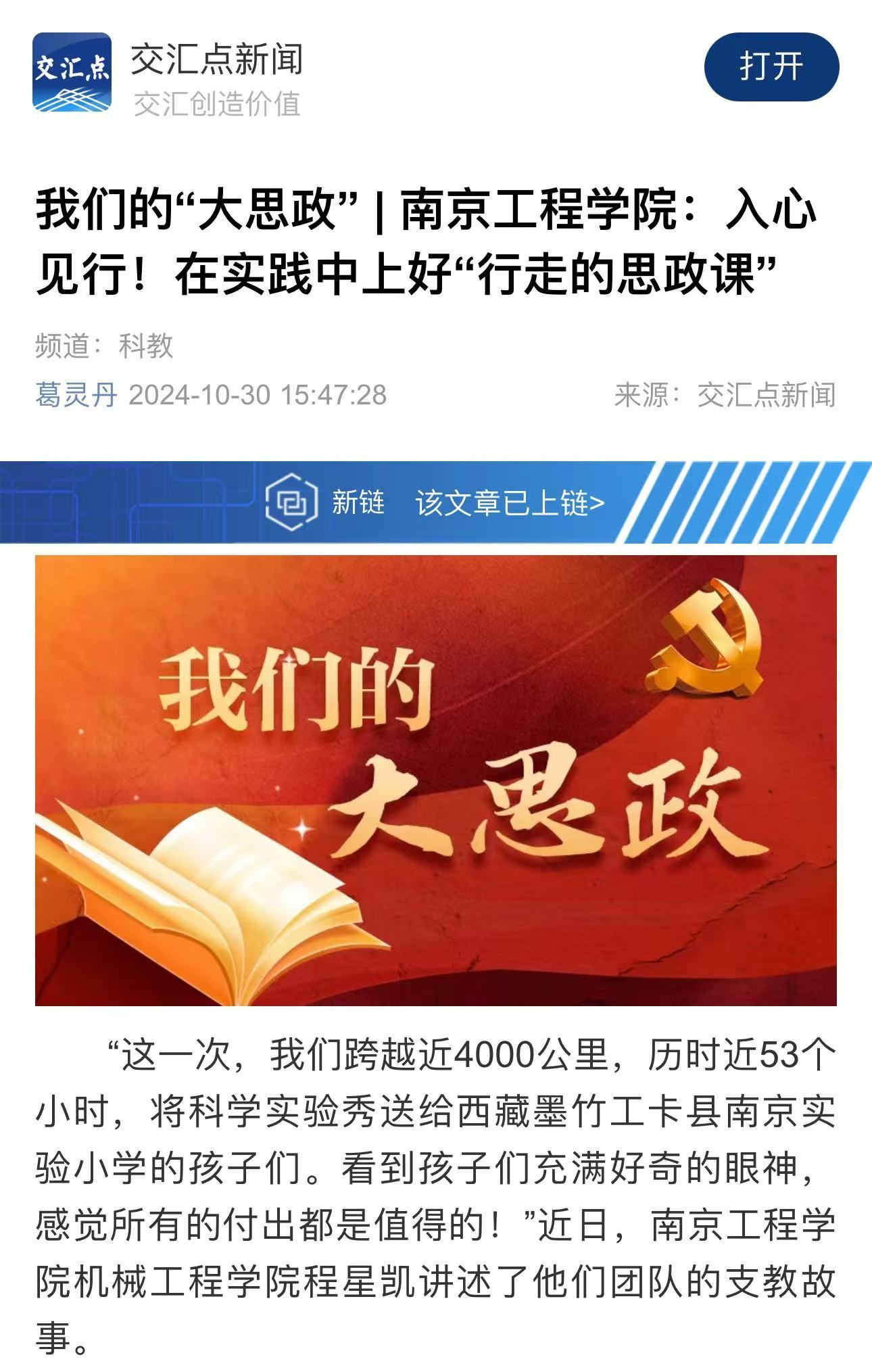 其实,在南工程,像科教公益行一样将“思政小课堂”与“社会大课堂”相结合的实践活动有很多。学校紧扣新时代新征程教育使命,创新推动思政课建设内涵式发展,组织师生走出教室,走出校园,在行走中完成一场场与历史和时代的“深度对话”,让思政课在教材里动起来,在课堂外活起来。
