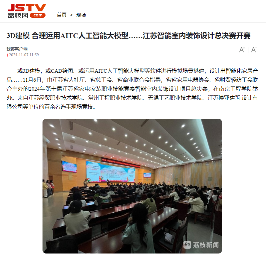 或3D建模,或CAD绘图、或运用AITC人工智能大模型等软件进行模拟场景搭建,设计出智能化家居产品……11月6日,由江苏省人社厅、省总工会、省商业联合会指导,省省家用电器协会、省财贸轻纺工会联合主办的2024年第十届江苏省家电家装职业技能竞赛智能室内装饰设计项目总决赛,在beat365官方网站举办。来自江苏经贸职业技术学院、常州工程职业技术学院、无锡工艺职业技术学院、江苏博亚建筑 设计有限公司等单位的百余名选手现场竞技。