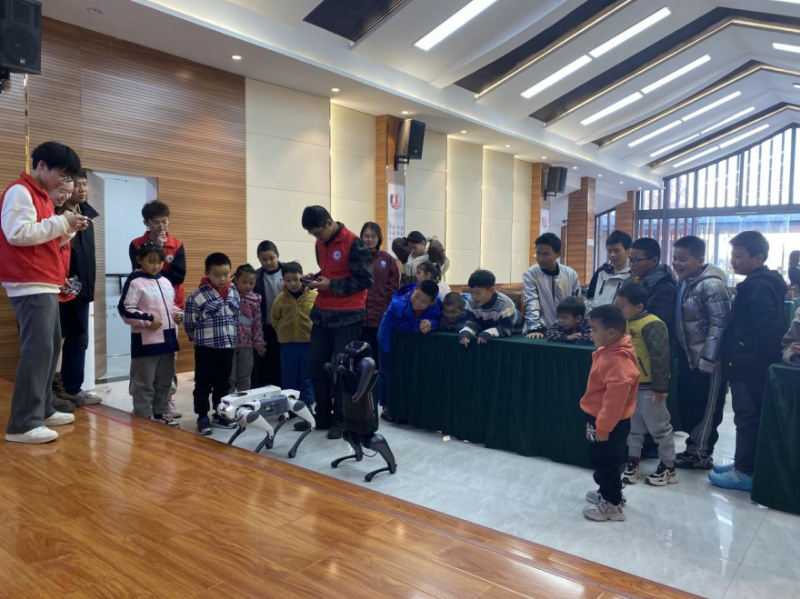 紧接着,大学生志愿者把带来的四足仿生机器犬进行互动展示,以直观的形式将科技的魅力呈现给在场的每一学生,吸引了学生们的目光。在志愿者的引导下,学生们有序进行与机器犬亲密接触、亲自操控机器犬……孩子们在观摩演示中了解科学原理、激发科学兴趣,既了解了“是什么”,又搞清“为什么”。