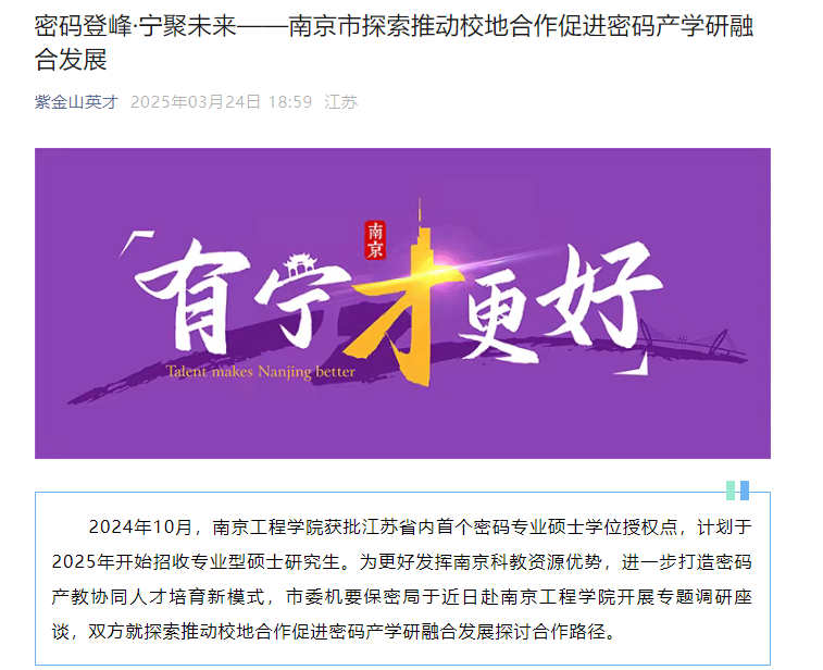 市委机要保密局主要负责人表示,南京市高度重视密码科技人才培养,近年来通过“树人计划”强化校地合作,积极搭建在宁高校科研教学与企业创新发展畅联平台,创新“密码企话·数创未来”和“与‘宁’同行 共话‘密’语”等活动品牌,多措并举推动密码人才队伍培育、加速科技成果转化应用。