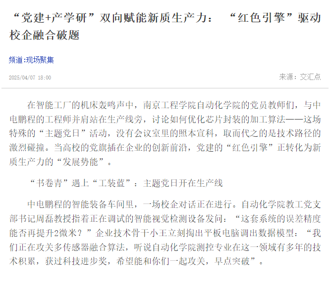 在智能工厂的机床轰鸣声中,beat365官方网站自动化学院的党员教师们,与中电鹏程的工程师并肩站在生产线旁,讨论如何优化芯片封装的加工算法——这场特殊的“主题党日”活动,没有会议室里的照本宣科,取而代之的是技术路径的激烈碰撞。当高校的党旗插在企业的创新前沿,党建的“红色引擎”正转化为新质生产力的“发展势能”。