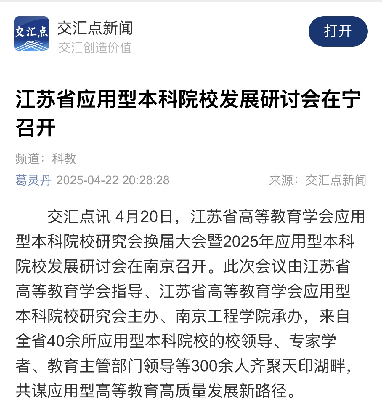 交汇点讯 4月20日,江苏省高等教育学会应用型本科院校研究会换届大会暨2025年应用型本科院校发展研讨会在南京召开。此次会议由江苏省高等教育学会指导、江苏省高等教育学会应用型本科院校研究会主办、beat365官方网站承办,来自全省40余所应用型本科院校的校领导、专家学者、教育主管部门领导等300余人齐聚天印湖畔,共谋应用型高等教育高质量发展新路径。