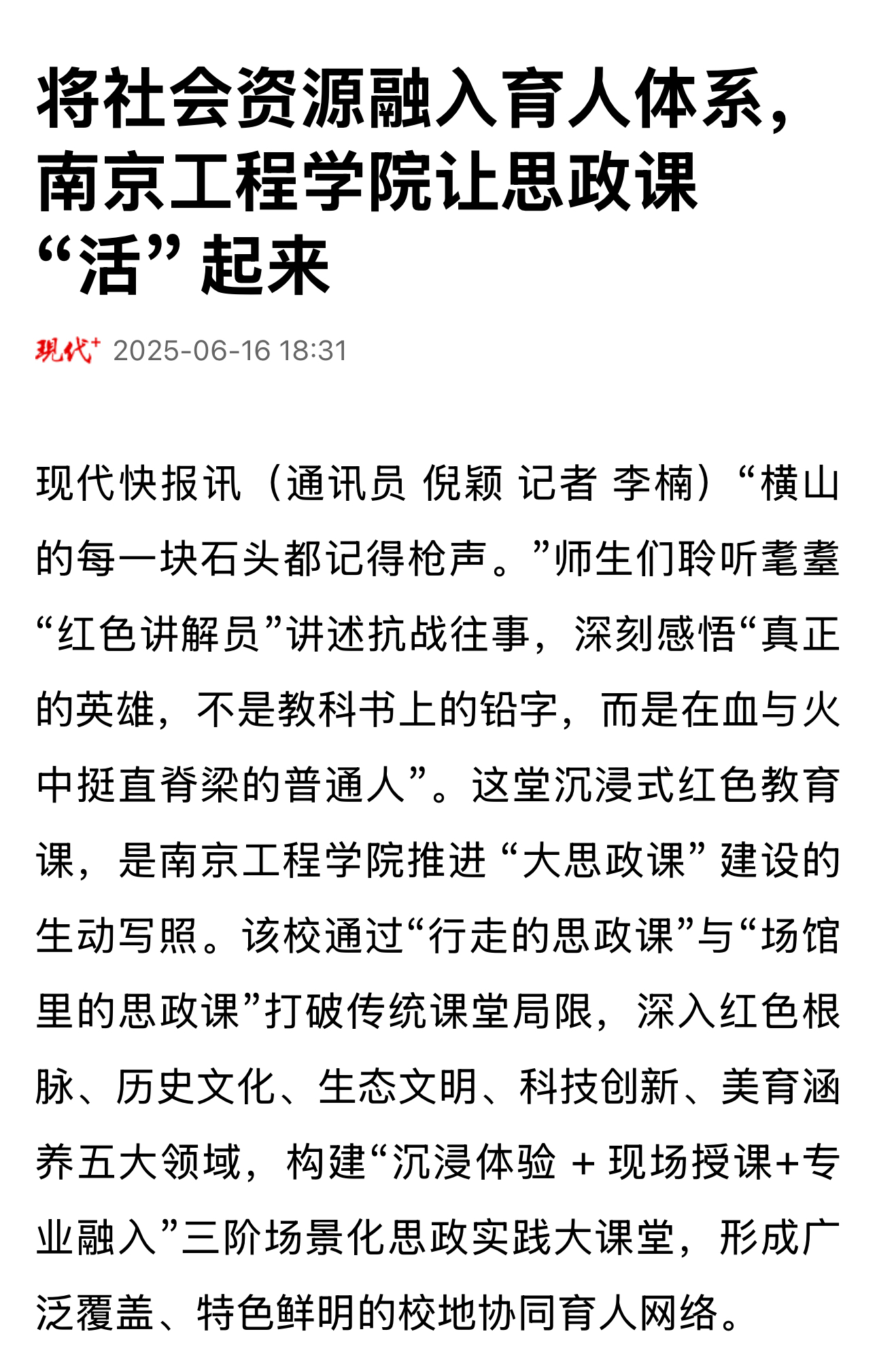 现代快报讯(通讯员 倪颖 记者 李楠)“横山的每一块石头都记得枪声。”师生们聆听耄耋“红色讲解员”讲述抗战往事,深刻感悟“真正的英雄,不是教科书上的铅字,而是在血与火中挺直脊梁的普通人”。这堂沉浸式红色教育课,是beat365官方网站推进 “大思政课” 建设的生动写照。该校通过“行走的思政课”与“场馆里的思政课”打破传统课堂局限,深入红色根脉、历史文化、生态文明、科技创新、美育涵养五大领域,构建“沉浸体验 + 现场授课+专业融入”三阶场景化思政实践大课堂,形成广泛覆盖、特色鲜明的校地协同育人网络。
