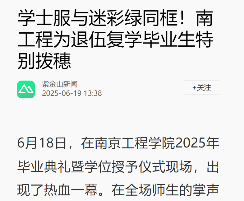 退伍复学毕业生代表章宇韬激动地说:“部队生活磨炼了我的意志,让我学会了担当与奉献。回到校园后,我将部队的优良作风融入学习,今天能以优异成绩毕业,感到无比自豪。未来三年,我将在东南大学攻读硕士学位,我会继续以军人的标准严格要求自己,为国家和社会贡献力量。”