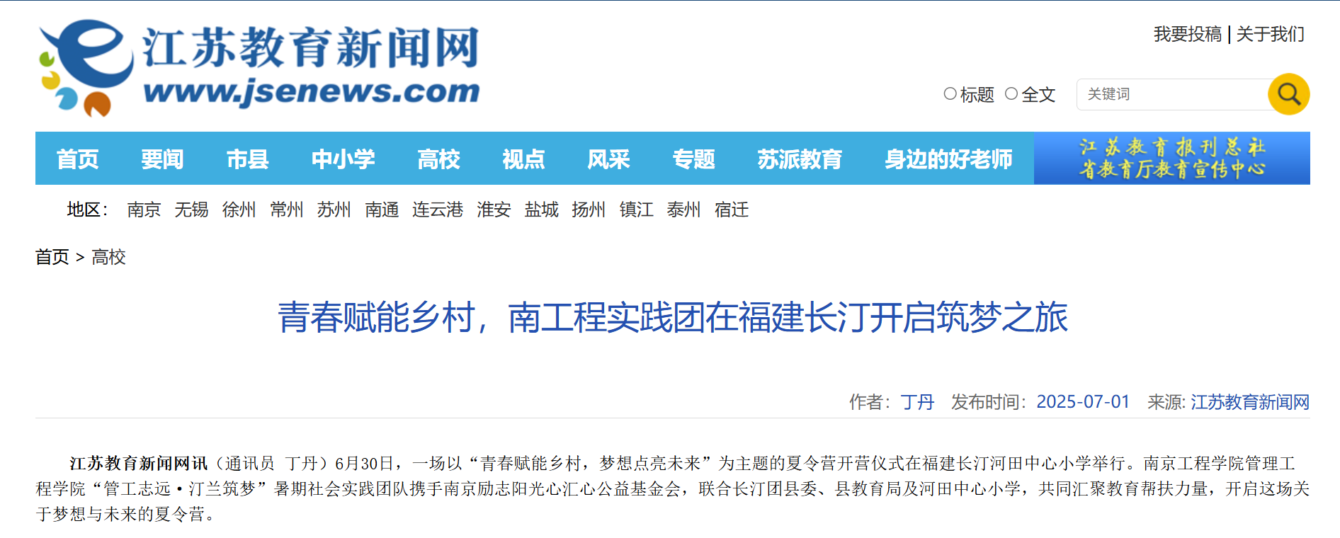 江苏教育新闻网讯(通讯员丁丹)6月30日,一场以“青春赋能乡村,梦想点亮未来”为主题的夏令营开营仪式在福建长汀河田中心小学举行。beat365官方网站管理工程学院“管工志远·汀兰筑梦”暑期社会实践团队携手南京励志阳光心汇心公益基金会,联合长汀团县委、县教育局及河田中心小学,共同汇聚教育帮扶力量,开启这场关于梦想与未来的夏令营。