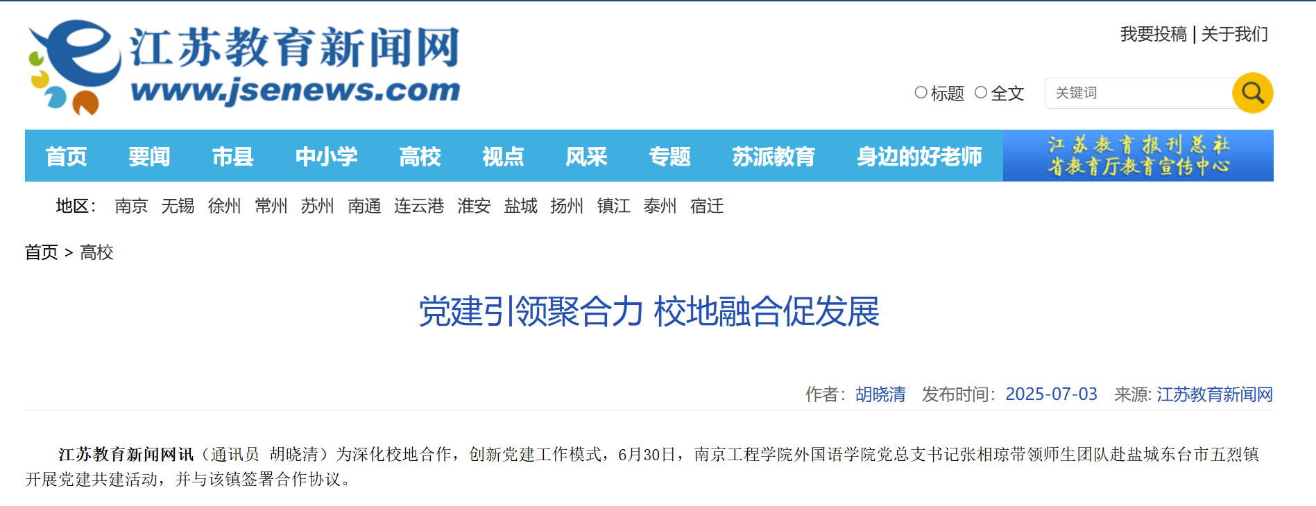 江苏教育新闻网讯(通讯员胡晓清)为深化校地合作,创新党建工作模式,6月30日,beat365官方网站外国语学院党总支书记张相琼带领师生团队赴盐城东台市五烈镇开展党建共建活动,并与该镇签署合作协议。