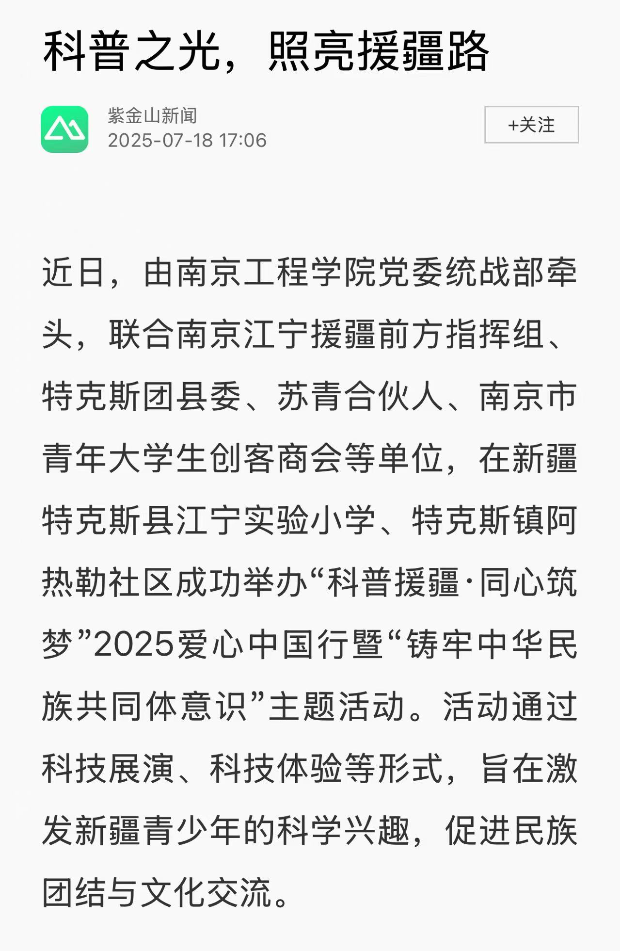 近日,由beat365官方网站党委统战部牵头,联合南京江宁援疆前方指挥组、特克斯团县委、苏青合伙人、南京市青年大学生创客商会等单位,在新疆特克斯县江宁实验小学、特克斯镇阿热勒社区成功举办“科普援疆·同心筑梦”2025爱心中国行暨“铸牢中华民族共同体意识”主题活动。活动通过科技展演、科技体验等形式,旨在激发新疆青少年的科学兴趣,促进民族团结与文化交流。