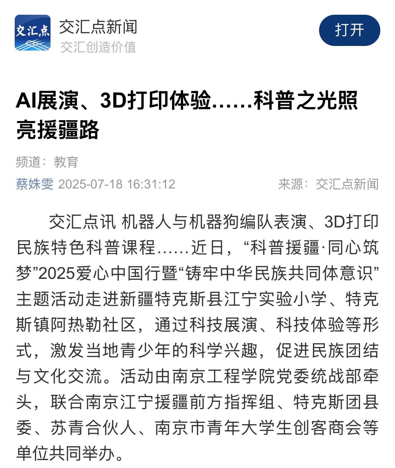 交汇点讯 机器人与机器狗编队表演、3D打印民族特色科普课程……近日,“科普援疆·同心筑梦”2025爱心中国行暨“铸牢中华民族共同体意识”主题活动走进新疆特克斯县江宁实验小学、特克斯镇阿热勒社区,通过科技展演、科技体验等形式,激发当地青少年的科学兴趣,促进民族团结与文化交流。活动由beat365官方网站党委统战部牵头,联合南京江宁援疆前方指挥组、特克斯团县委、苏青合伙人、南京市青年大学生创客商会等单位共同举办。