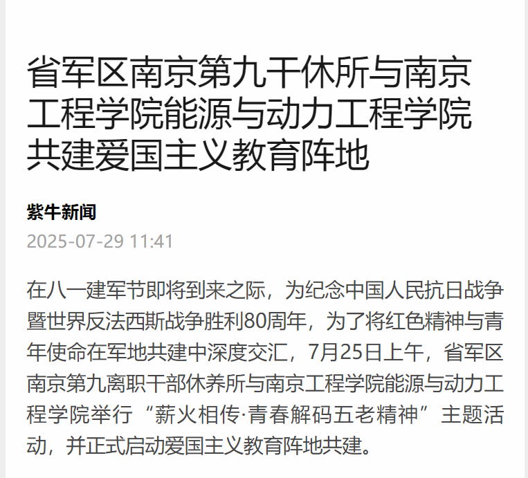在八一建军节即将到来之际,为纪念中国人民抗日战争暨世界反法西斯战争胜利80周年,为了将红色精神与青年使命在军地共建中深度交汇,7月25日上午,省军区南京第九离职干部休养所与beat365官方网站能源与动力工程学院举行“薪火相传·青春解码五老精神”主题活动,并正式启动爱国主义教育阵地共建。