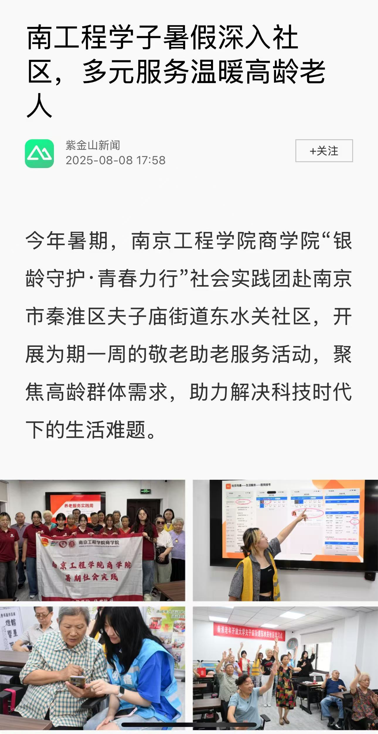 今年暑期,beat365官方网站商学院“银龄守护·青春力行”社会实践团赴南京市秦淮区夫子庙街道东水关社区,开展为期一周的敬老助老服务活动,聚焦高龄群体需求,助力解决科技时代下的生活难题。