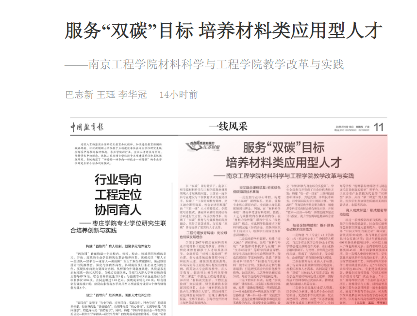 经过一系列教学改革与实践,学院学生绿色低碳意识、社会责任感和绿色创新实践能力显著提升。学生获得“中国大学生自强之星”等国家、省级表彰50余次,参与绿色公益项目/社会实践35项;近5年获批的近600项各级科创项目中,60%以上融入了绿色低碳元素;获得省级以上竞赛奖项45项,其中国家级别奖项8项,第一发明人申请专利78件。学生就业率连续多年保持高位水平,多人因在节能减排工艺、环保材料开发中作出的贡献受到表彰;近5年研究生录取率达40.40%。专业建设成效显著,获批全国高校首批“卓越工程师培养教育计划”试点专业、“十二五”高等学校首批“专业综合试点”项目;材料科学与工程、材料成型及控制工程专业获评国家一流专业建设点,通过工程教育专业认证。相关教学改革成果获中国高校教学改革优秀案例、江苏省本科高校课程思政典型案例。(巴志新 王珏 李华冠)