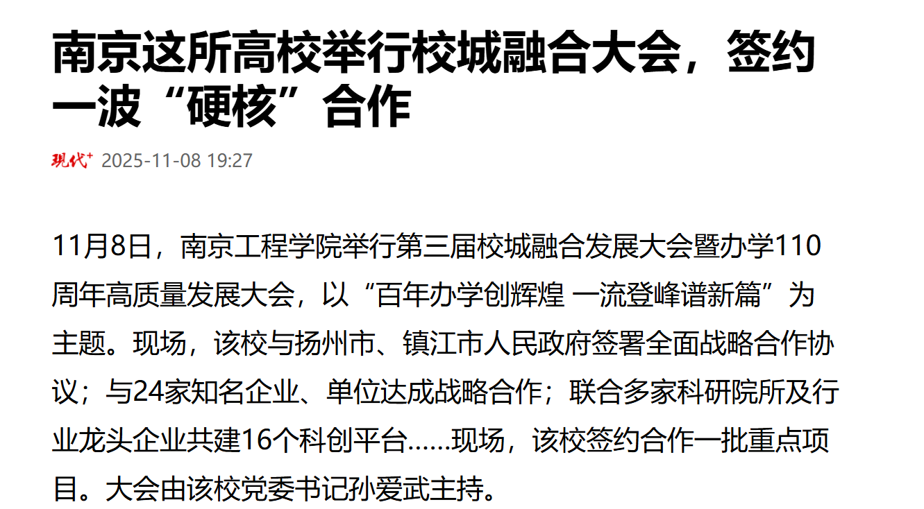 此外,该校与南京建邺高新区、宿迁高新区共建的“双高协同创新中心”正式揭牌;同时,与江宁区人民政府携手打造的“天印湖科技创新示范区”也正式启动,共同构筑产教融合与区域创新的新高地。