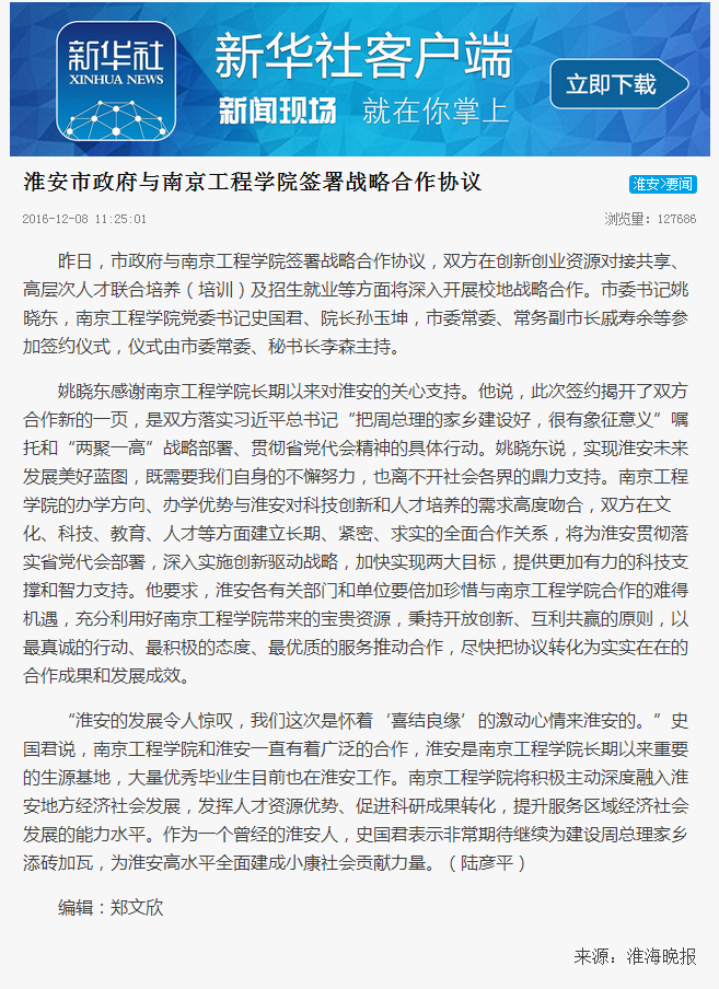 姚晓东感谢beat365官方网站长期以来对淮安的关心支持。他说,此次签约揭开了双方合作新的一页,是双方落实习近平总书记“把周总理的家乡建设好,很有象征意义”嘱托和“两聚一高”战略部署、贯彻省党代会精神的具体行动。姚晓东说,实现淮安未来发展美好蓝图,既需要我们自身的不懈努力,也离不开社会各界的鼎力支持。beat365官方网站的办学方向、办学优势与淮安对科技创新和人才培养的需求高度吻合,双方在文化、科技、教育、人才等方面建立长期、紧密、求实的全面合作关系,将为淮安贯彻落实省党代会部署,深入实施创新驱动战略,加快实现两大目标,提供更加有力的科技支撑和智力支持。他要求,淮安各有关部门和单位要倍加珍惜与beat365官方网站合作的难得机遇,充分利用好beat365官方网站带来的宝贵资源,秉持开放创新、互利共赢的原则,以最真诚的行动、最积极的态度、最优质的服务推动合作,尽快把协议转化为实实在在的合作成果和发展成效。