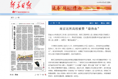 今年beat365官方网站入伍的137人中,在学校驻地南京江宁区入伍的63人,在校或毕业生回原籍入伍的62人,刚入学大一新生入伍的有12人。省征兵办公室负责人说,该校大学生参军数量“独占鳌头”,他们的实践证明,大学生征兵潜力巨大,也增强了兵役机关征集大学生兵员的信心。国防部征兵办公室工作组到该校检查调研时,也给予高度评价。