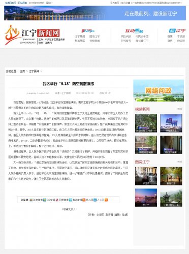 当天上午10:00,“呜——呜——”刺耳的防空警报声在江宁大地上骤然响起,同学们在区人防办工作人员的指导下,夹杂着“快跑、快跑”的喊声以及紧张的脚步声,有条不紊地冲出教室,来到楼下的广场上排上整齐的队伍。伴随着“开始疏散”的指挥声,新生们兵分三路进行紧急疏散,整个疏散集合过程用时不到2分钟。其中,200人登车前往区隐蔽工程,由工作人员为其发放应急食品;300人疏散至足球场开阔地域,由区人防办按战时预案组织撤离;300人有序隐蔽至大操场东侧树林,由人防志愿者现场为其讲解应急避难常识。10:08,当空袭警报响起时,疏散在学校大操场西侧树林里的新生,立即双手抱头,蹲坐在草地上,等待防空警报的解除。整个过程规范、有序。