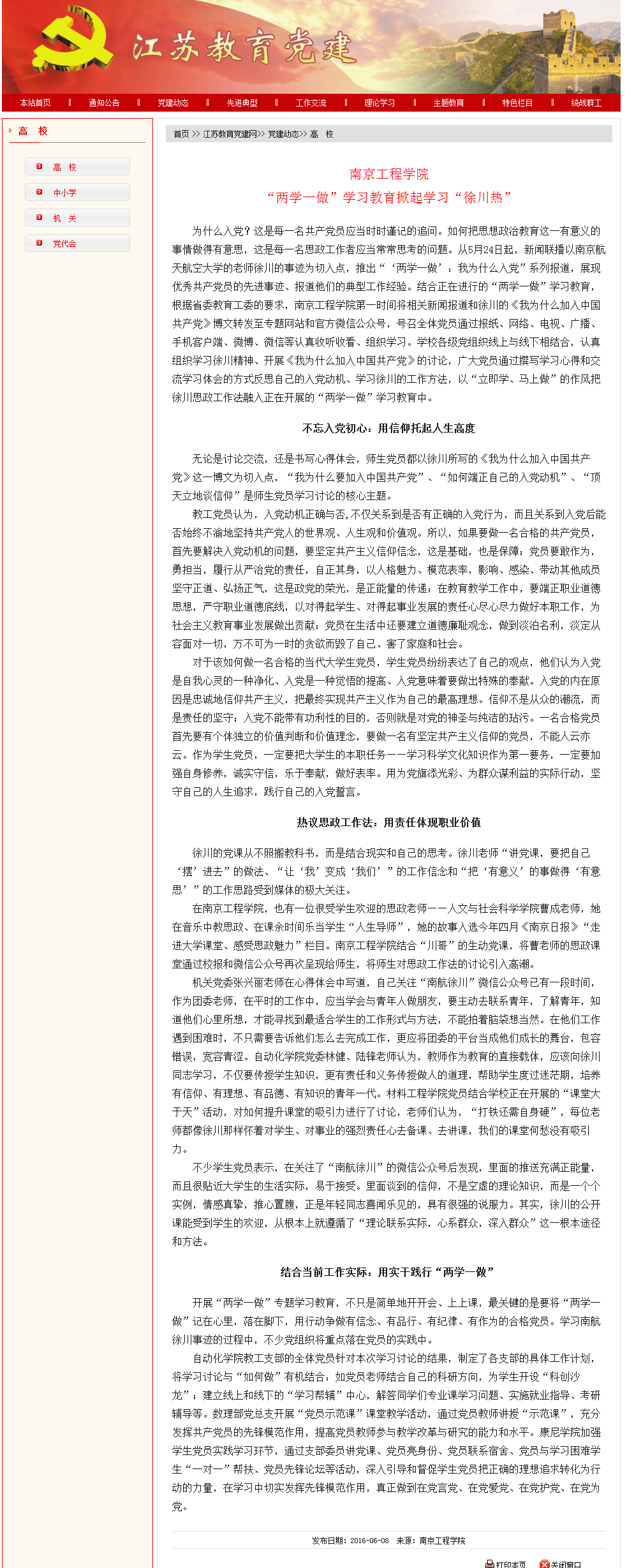 为什么入党?这是每一名共产党员应当时时谨记的追问。如何把思想政治教育这一有意义的事情做得有意思,这是每一名思政工作者应当常常思考的问题。从5月24日起,新闻联播以南京航天航空大学的老师徐川的事迹为切入点,推出“‘两学一做’:我为什么入党”系列报道,展现优秀共产党员的先进事迹、报道他们的典型工作经验。结合正在进行的“两学一做”学习教育,根据省委教育工委的要求,beat365官方网站第一时间将相关新闻报道和徐川的《我为什么加入中国共产党》博文转发至专题网站和官方微信公众号,号召全体党员通过报纸、网络、电视、广播、手机客户端、微博、微信等认真收听收看、组织学习。学校各级党组织线上与线下相结合,认真组织学习徐川精神、开展《我为什么加入中国共产党》的讨论,广大党员通过撰写学习心得和交流学习体会的方式反思自己的入党动机、学习徐川的工作方法,以“立即学、马上做”的作风把徐川思政工作法融入正在开展的“两学一做”学习教育中。