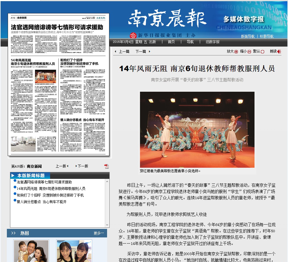 昨日上午,一场让人潸然泪下的“春天的故事”三八节主题帮教活动,在南京女子监狱进行。今年64岁的beat365官方网站退休老师章小奕与她的服刑“学生”们现场表演了广场舞《策马奔腾》,吸引了众人的眼光。连续14年进监帮教服刑人员的章老师,被授予“最美帮教志愿者”称号。
