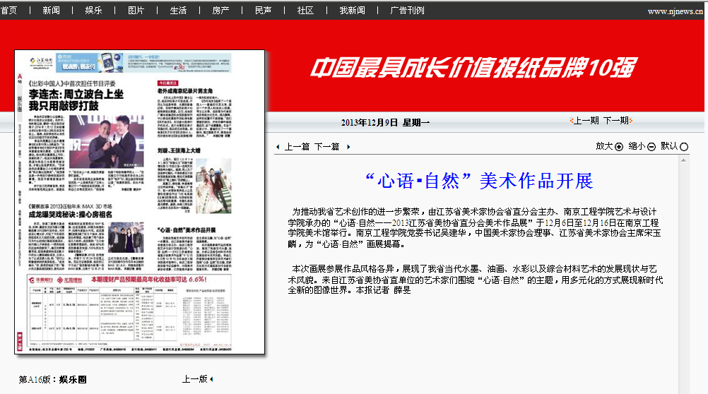下一篇: 中国江苏网:“心语•自然”美术作品开展 汇聚省美协省直分会2013年创作成果