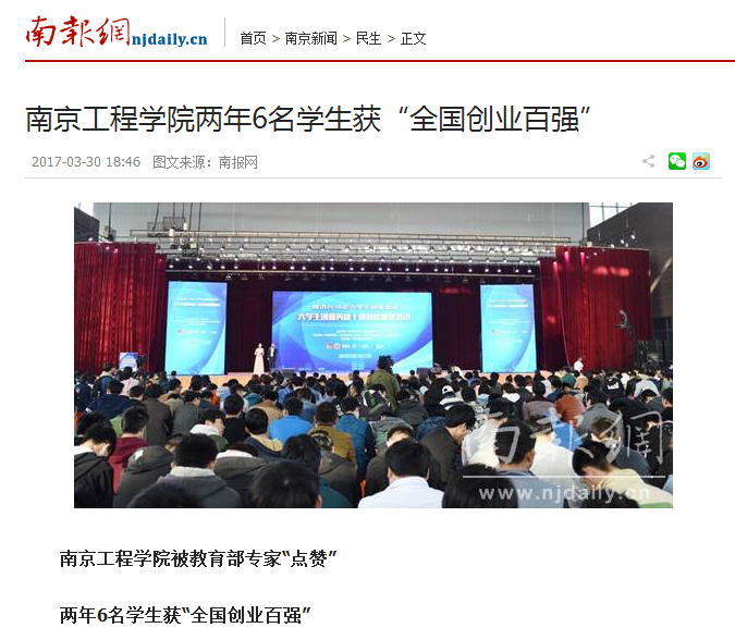 今年刚刚揭晓的“2016全国大学生创业英雄百强”中,江苏4人上榜,南工程有两人;去年揭晓的“2015全国大学生创业英雄百强”中,江苏4人上榜,4人全是南工程学生。