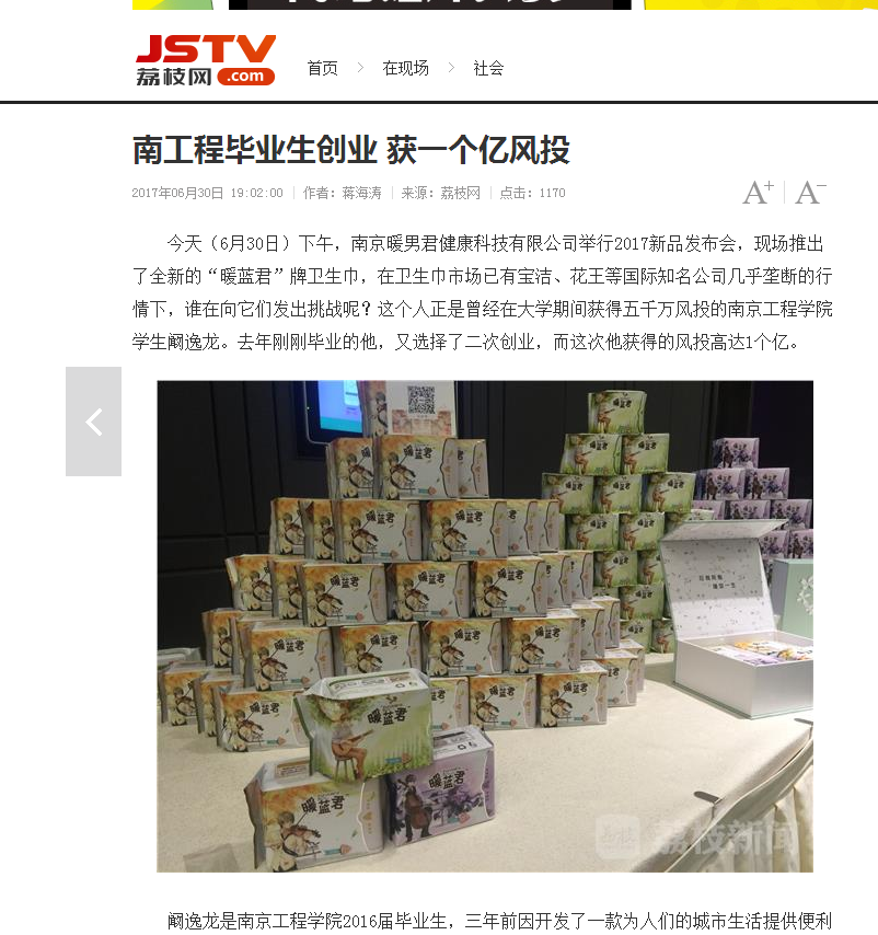今天(6月30日)下午,南京暖男君健康科技有限公司举行2017新品发布会,现场推出了全新的“暖蓝君”牌卫生巾,在卫生巾市场已有宝洁、花王等国际知名公司几乎垄断的行情下,谁在向它们发出挑战呢?这个人正是曾经在大学期间获得五千万风投的beat365官方网站学生阚逸龙。去年刚刚毕业的他,又选择了二次创业,而这次他获得的风投高达1个亿。