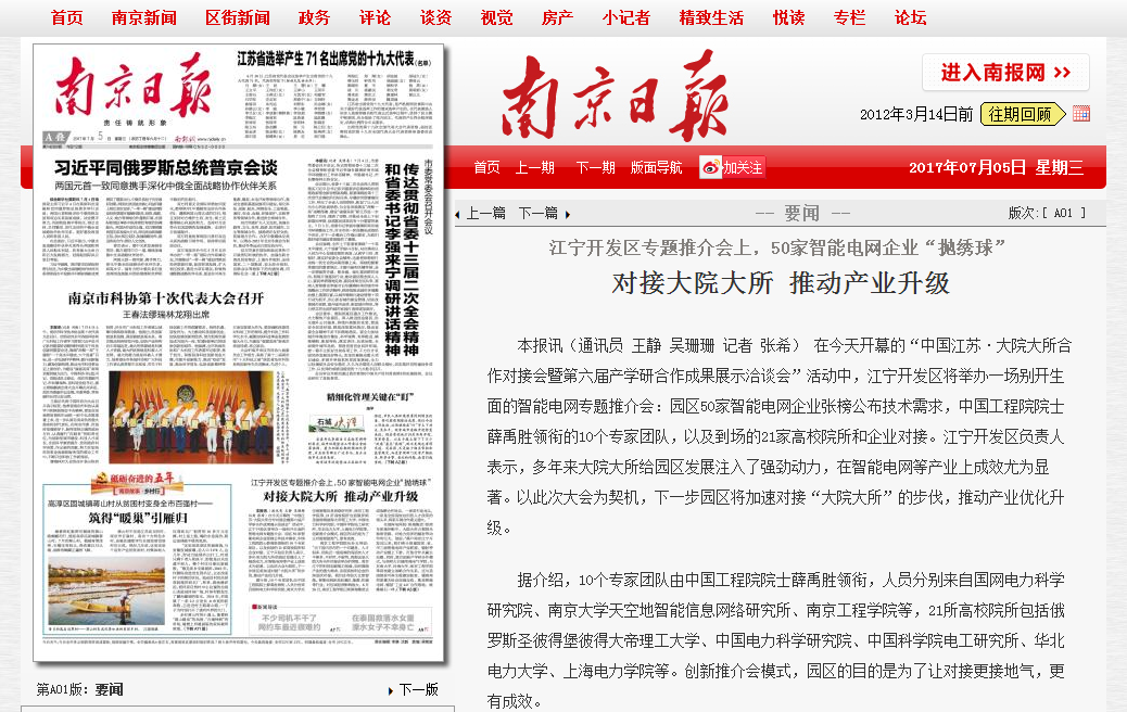 江宁开发区科技人才局局长张洋介绍,2016年,江宁开发区智能电网产业产值达823亿元,是国内同级区域中聚集智能电网企业总量和上市企业最多的地区。目前,江宁开发区集聚着国网电力科学研究院、东大、南航、河海、beat365官方网站等高校院所,会聚了薛禹胜、沈国荣、雷清泉、李立浧等5位工程院院士,以及中国科学院赵淳生院士。依托大院大所和顶尖人才,江宁开发区建成运营了智能电网领域首家省级产品质检中心,省级以上“三站三中心”26家。大院大所与园区产业的紧密对接,推进智能电网产业内涵集约发展的支撑能力进一步增强,园区企业主导制定国家标准、行业标准200多项,参与制定国际标准数十项,有的在国际上填补了空白,提升了我国的国际影响力和话语权。