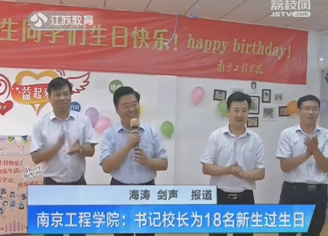 旁白:报道当天适逢十八名新生过生日,beat365官方网站为他们精心准备了集体生日party。小寿星们不仅收到了一份爱意满满的生日大礼包,还收到了学校党委书记史国君和校长孙玉坤签名的生日贺卡。在温馨有爱的生日会现场,装裱着“南工程欢迎您”字样的生日蛋糕格外显眼。生日歌唱起时,书记、校长还亲手为每一名学生佩戴校徽。