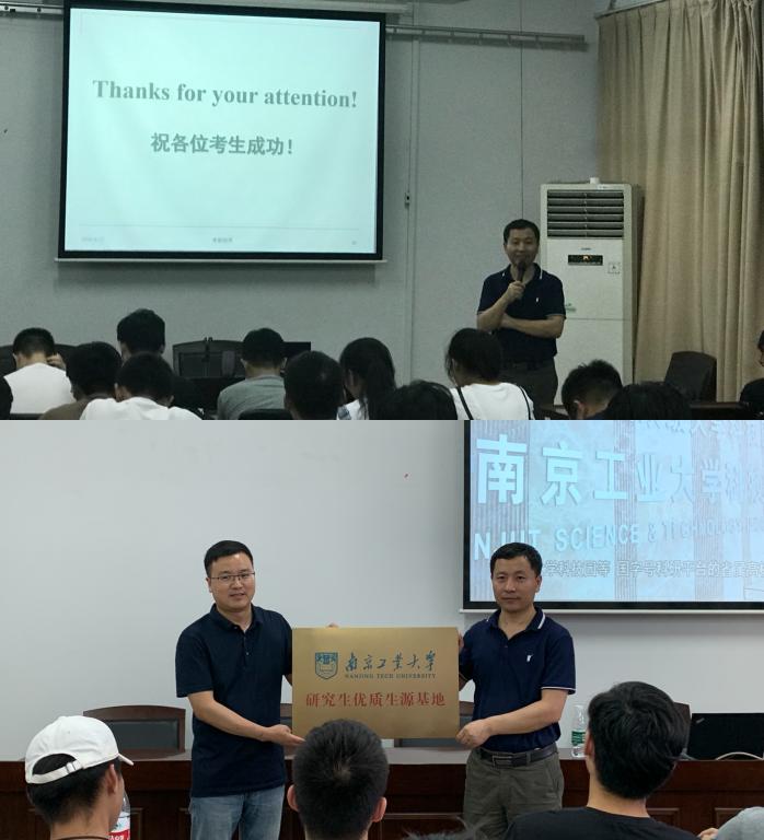 为进一步调动学生考研积极性,加强同学们对计算机相关专业考研形势的了解,6月27日晚,计算机工程学院特邀南京工业大学计算机科学与技术学院的副院长刘学军老师为该院学生指点考研迷津,刘院长代表南京工业大学研究生院和计算机科学与技术学院授予该院“南京工业大学研究生优质生源基地”铜牌。