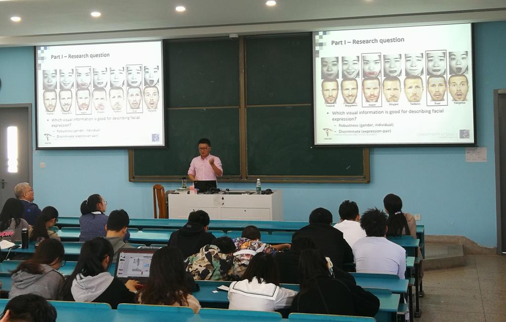 黄晓华教授博士毕业于芬兰奥卢大学计算机科学与工程学院,曾就职于奥卢大学机器视觉与信号分析中心。主要研究方向包括情感识别、计算机视觉、图像处理和深度学习,已在国际会议和期刊上累计发表四十余篇高水平的学术论文。在讲座中,黄晓华教授介绍了自己的学习经历以及在奥卢大学学习与工作的见闻和收获,分享了本人在微表情识别的科研成果和体会。他详细讲解了情绪模型的发展历程、基于面部的情绪分析及其进展,从心理学角度和计算机视觉角度介绍了最近比较热门的微表情识别。通过表情捕捉视频的具体案例,同学们加深了对“通过计算机捕捉表情识别人类心理”的理解与认识。